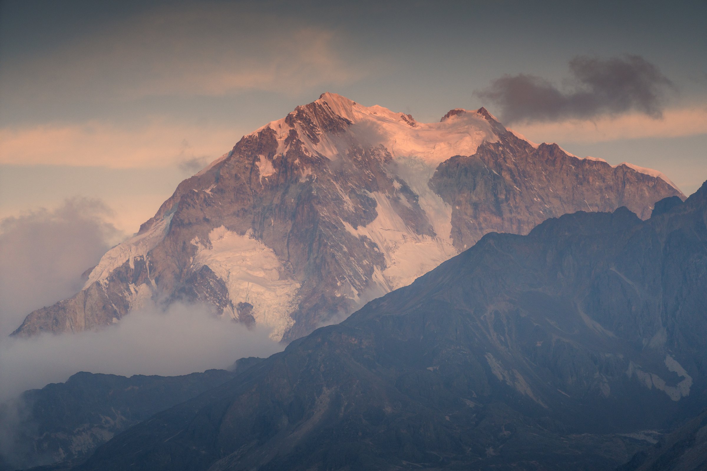 Snow-capped mountain peak with surrounding mountains and clouds, during sunset or sunrise. View fullsize